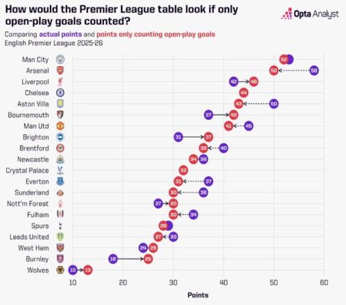 ▲如果僅計(jì)算運(yùn)動(dòng)戰(zhàn)進(jìn)球,英超聯(lián)賽的排名表變化。