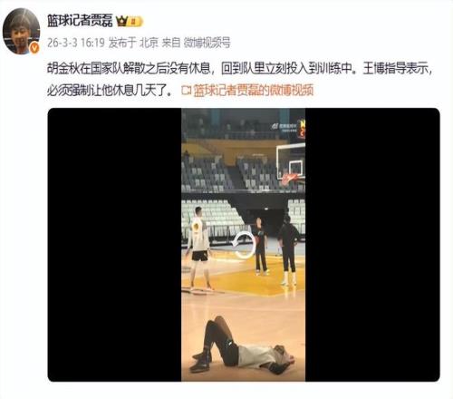 胡金秋回國后,本來可以休息幾天(上海國手李弘權(quán)就獲準(zhǔn)長假),但是大秋國家隊解散后,馬上投入集訓(xùn)。據(jù)籃球記者賈磊透露,“胡金秋在國家隊解散之后沒有休息,回到隊里立刻投入到訓(xùn)練中。王博指導(dǎo)表示,必須強制讓他休息幾天了”。顯然勤奮的胡金秋是拒絕了王博的要求,沒有休息。從視頻看到,胡金秋回到俱樂部后,立刻就訓(xùn)練,有兩人陪他訓(xùn)練,如此勤奮,也怪不得他的技術(shù)這么好。