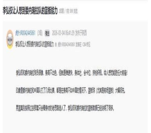 球迷們更是分析了李弘權(quán)現(xiàn)象,希望中國隊員甚至所有CBA球員能從李弘權(quán)身上學點什么。球迷分析道:李弘權(quán)和委內(nèi)瑞拉球員很像,身高不出色,但就是彈速快,身體壯,會卡位,拼搶積極。給人感覺能勝任大前鋒!印象里委內(nèi)瑞拉和中國隊打了幾場比賽,都是在身高不如中國的情況下,籃板球(尤其是前場籃板)大幅領(lǐng)先。男籃真別按照過去那套只會看身材的老思路選人了,李弘權(quán)和委內(nèi)瑞拉的籃板數(shù)據(jù)已經(jīng)說明了很多。