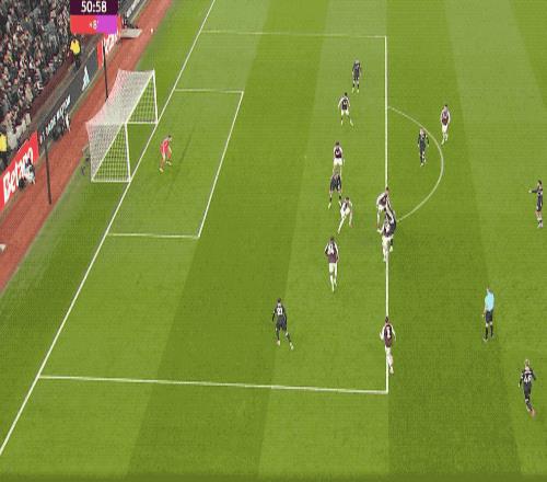 第30分鐘,維拉的傳跑時機恰到好處,沃特金斯起腳射門,約根森輕舒猿臂,完成封堵。