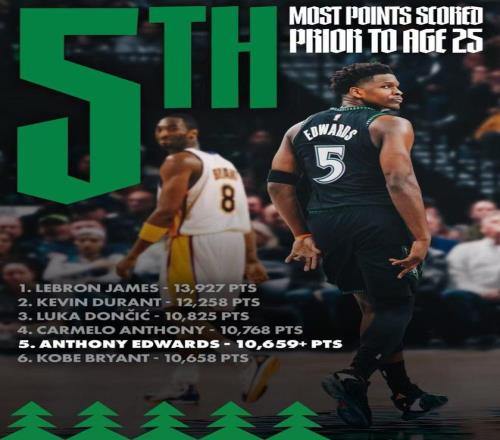 愛德華茲25歲前總得分超越科比升至歷史第5位,僅次于詹姆斯、杜蘭特、東契奇與安東尼。