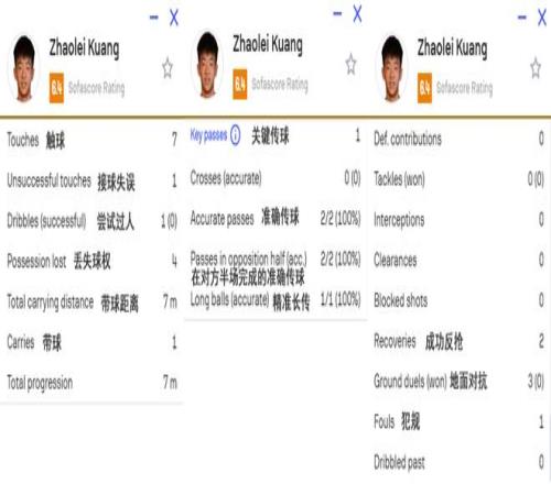 這上場(chǎng)后10分鐘內(nèi),鄺兆鐳一共觸球7次,1次接球失誤,1次嘗試過(guò)人但沒有成功,另外還有4次丟失球權(quán),有2次成功反搶。另外他還有3次跟對(duì)手進(jìn)行地面對(duì)抗但都失敗,還有1次犯規(guī),1次帶球7米遠(yuǎn)。鄺兆鐳最亮眼的數(shù)據(jù)來(lái)了——2次在對(duì)手半場(chǎng)的準(zhǔn)確傳球,1次精準(zhǔn)長(zhǎng)傳,還有1次關(guān)鍵傳球。