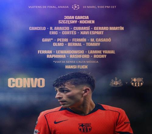 北京時(shí)間3月8日,巴薩官方公布了歐冠1/8決賽首回合對陣紐卡斯?fàn)柭?lián)的大名單。