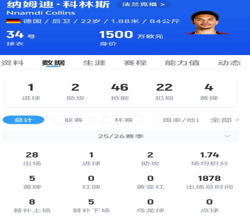 納姆迪·科林斯目前22歲,本賽季為法蘭克福出場(chǎng)28次,貢獻(xiàn)1球2助攻和46次搶斷,目前身價(jià)1500萬(wàn)歐元。