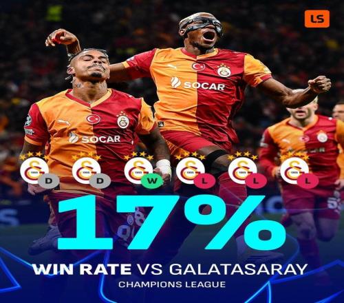 利物浦歐冠對(duì)加拉塔薩雷勝率僅17%,為交手5+次對(duì)手中最低