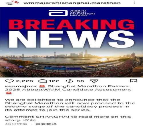 世界馬拉松大滿貫社交媒體宣布,上海馬拉松成功通過第一階段評估。
